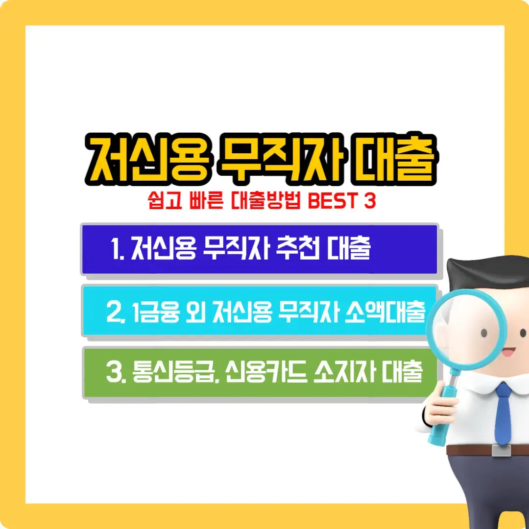 저신용 무직자는 대부분 대출받기 힘들지만 간편하고, 신속하게, 신뢰할 수 있는 곳에서 대출받을 수 있습니다. 10등급 무직자인 사람도 이용할 수 있는 대출상품까지 종합적으로 구분하고 정리하여 필요한 자금을 마련하는데 도움받을 수 있게 해 드리겠습니다. 3분, 300만 원, 3가지 방법을 기억하세요.